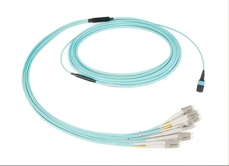 This 12F break out cable with MTP/MPO to LC interface is designed for high-density cabling, featuring oneTP/MPO connector that branches out into 12 independent LC interfaces, efficiently connecting trunk lines to equipment. With double jacket cables and miniature metal protective components to enhance durability, serial number design for easy management, it is suitable for complex network environments such as data centers.